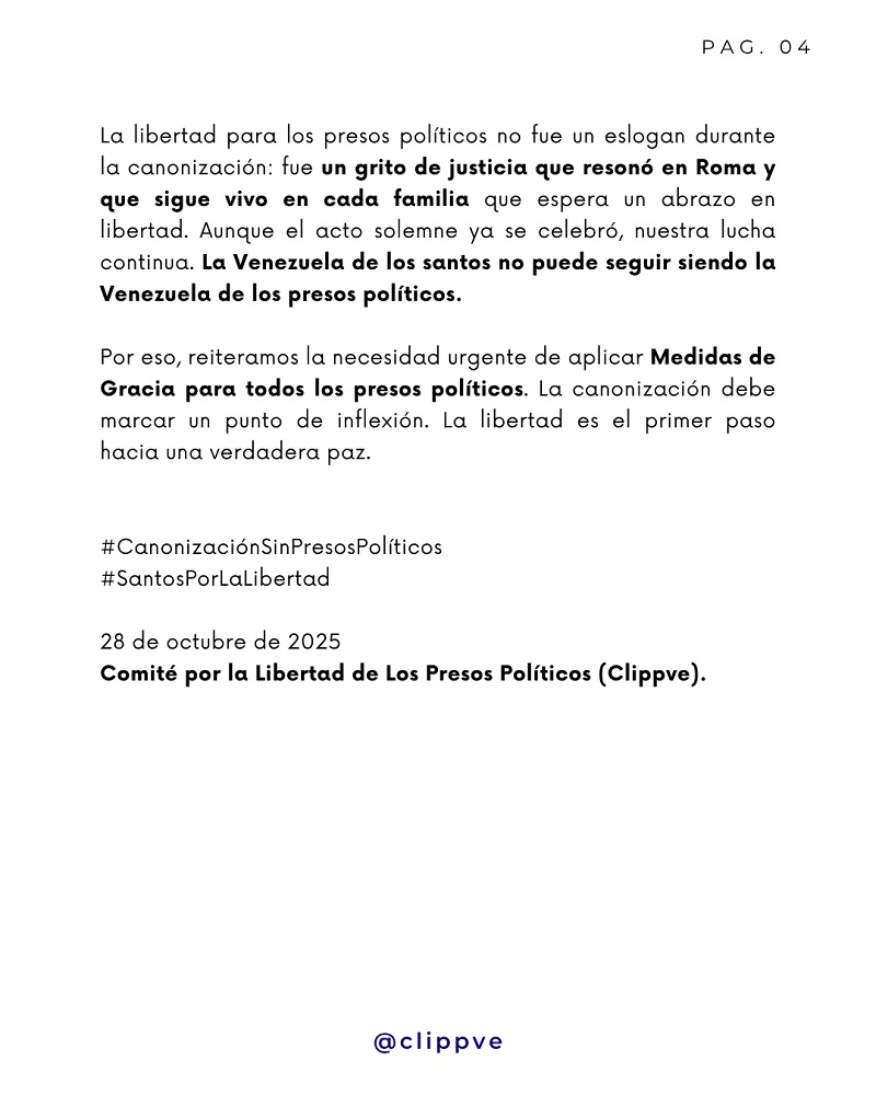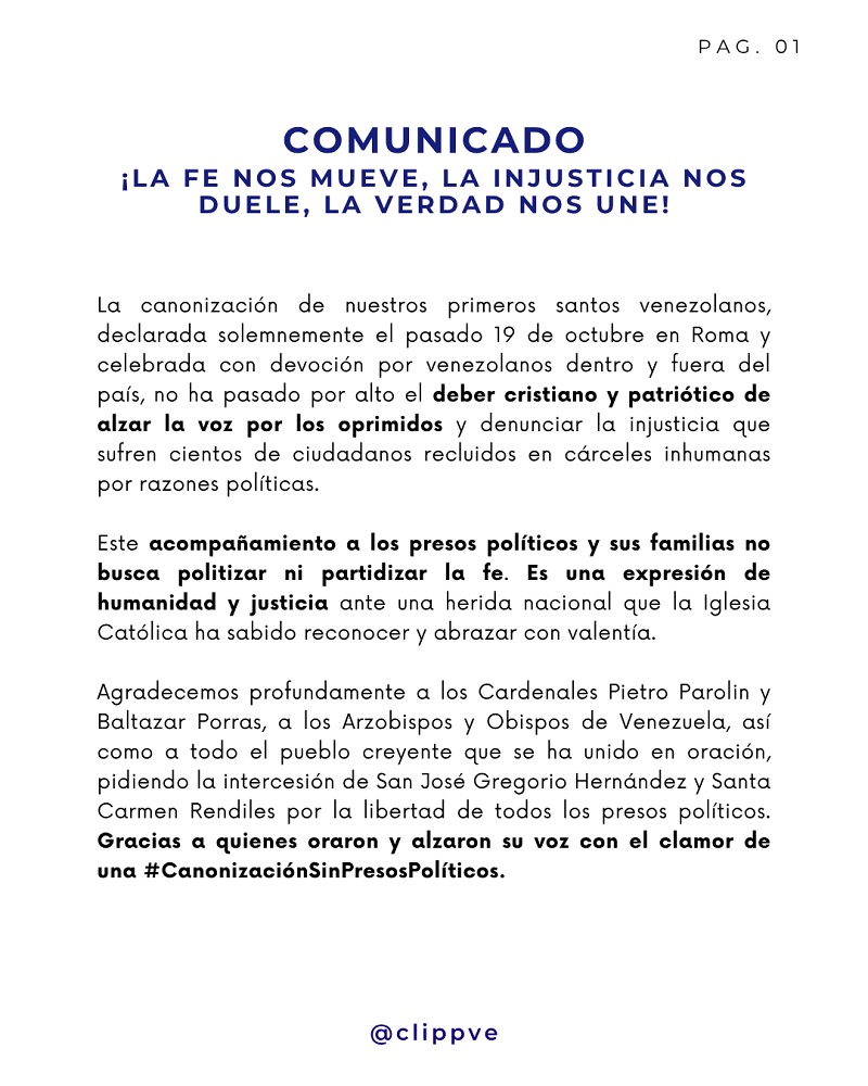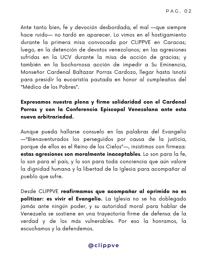 La ONG Comité por la Libertad de los Presos Políticos (Clippve) se solidarizó con el Cardenal Baltazar Porras, quien denunció que no pudo llegar a Isnotú, estado Trujillo el pasado sábado por impedimento del régimen de Maduro, donde se festejaba la canonización y la víspera del natalicio del primer santo venezolano, José Gregorio Hernández.