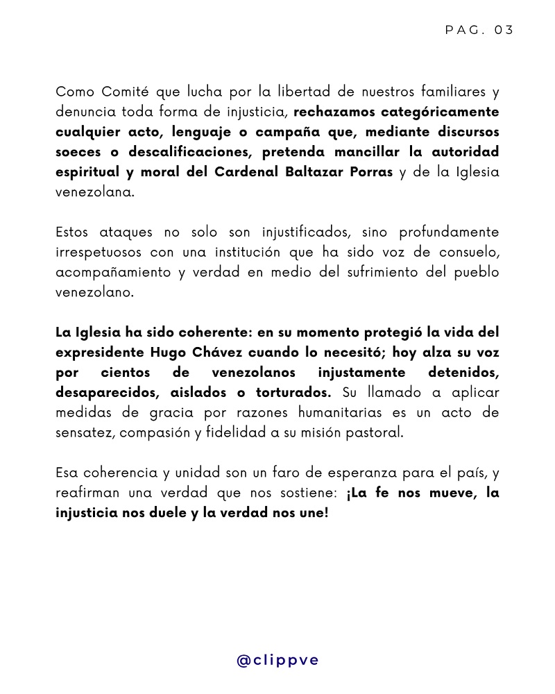 «Rechazamos categóricamente cualquier acto, lenguaje o campaña que, mediante discursos soeces o descalificaciones, pretenda mancillar la autoridad espiritual y moral del cardenal Baltazar Porras y de la Iglesia venezolana», expresó la organización en un comunicado, compartido en su cuenta de X.