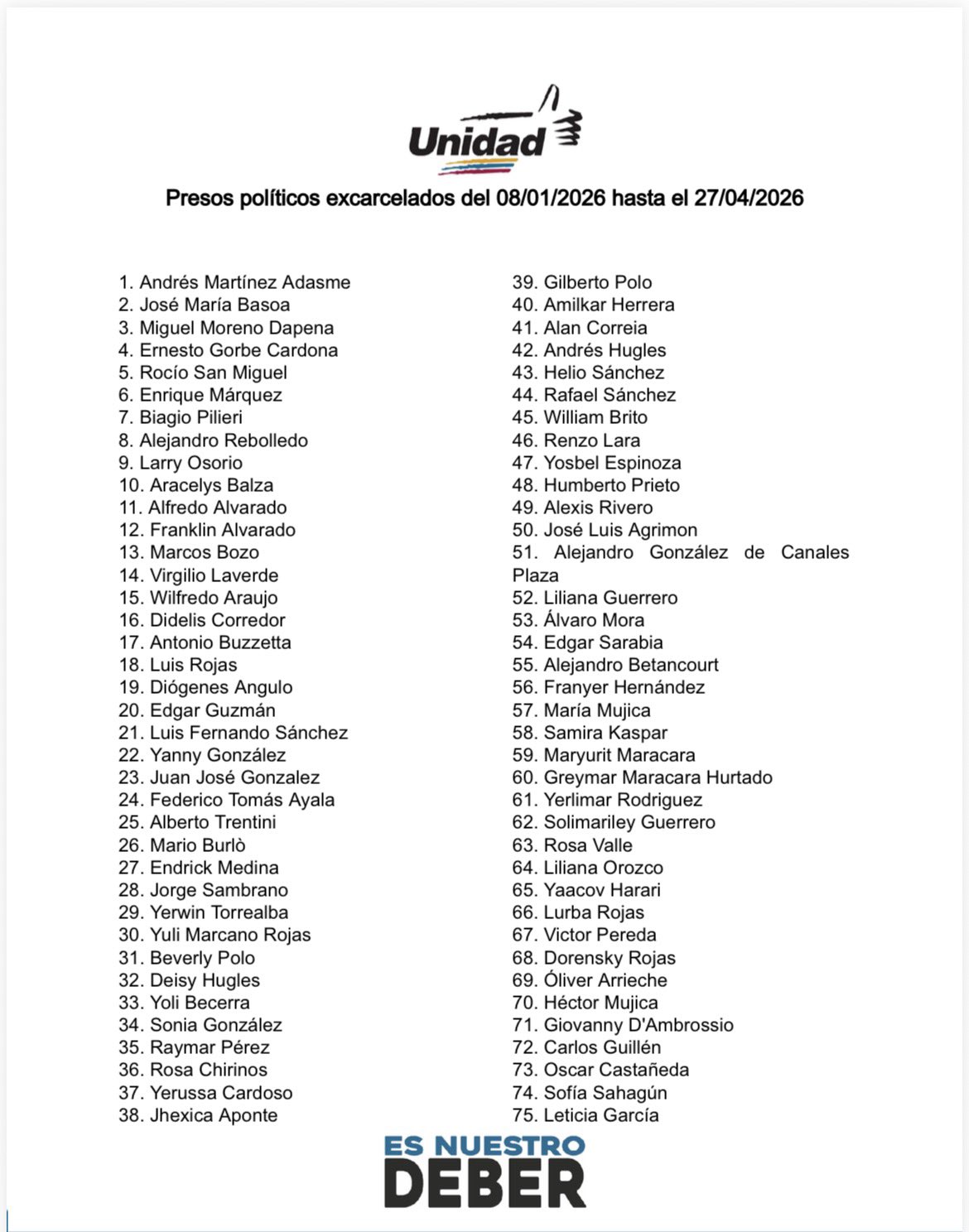 Siendo las 07 pm de hoy, lunes 27 de abril, esta es la cifra actualizada de liberaciones que hemos podido verificar hasta el momento.