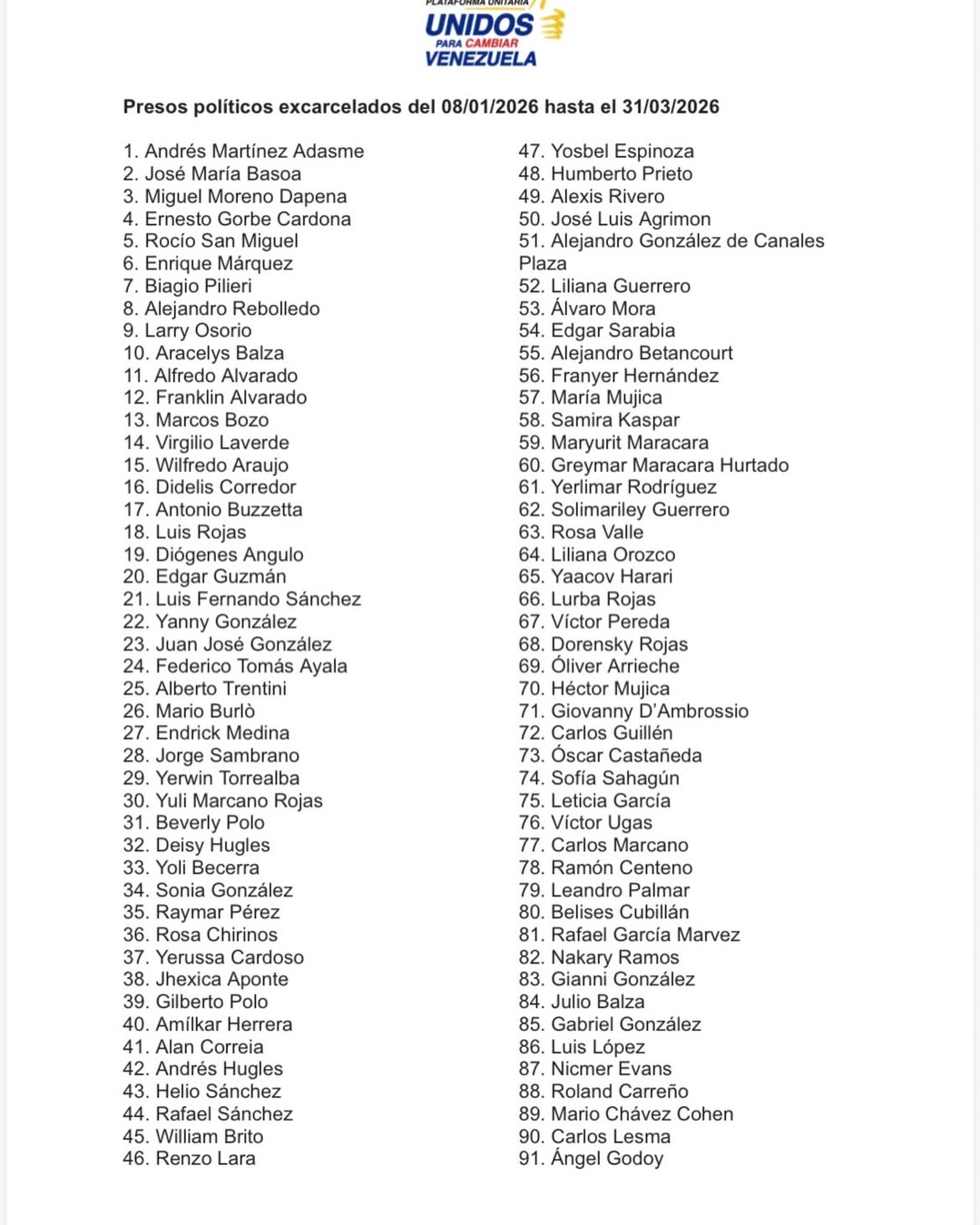 «Este martes 31 de marzo, 460 es la cifra actualizada de liberaciones que hemos podido verificar hasta el momento. Desde nuestro último reporte del día 22/03 solo hemos verificado 12 liberaciones por lo cual exigimos una vez más procesos de liberaciones masivos, expeditos, públicos y transparentes que garanticen la libertad de TODOS los presos políticos. Para la libertad de TODOS solo se necesita voluntad política», destacó el conglomerado de partidos políticos de la oposición venezolana.