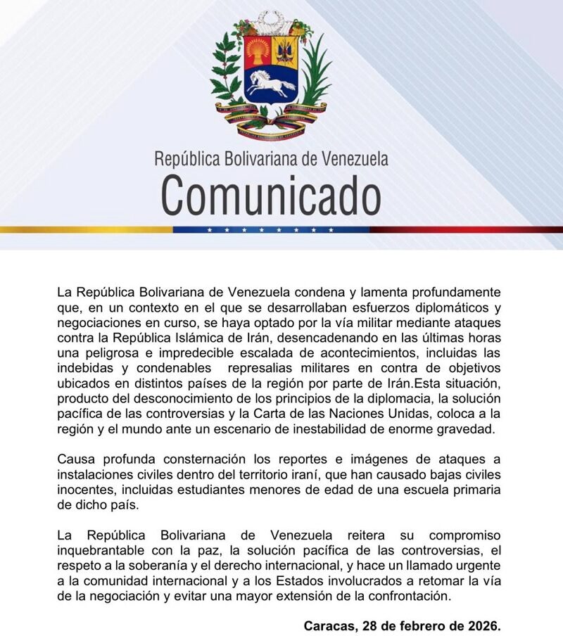 «Causa profunda consternación los reportes e imágenes de ataques a instalaciones civiles dentro del territorio iraní, que han causado bajas de civiles inocentes, incluidos estudiantes menores de edad de una escuela primaria», indicó la Cancillería venezolana en un comunicado publicado en Telegram.