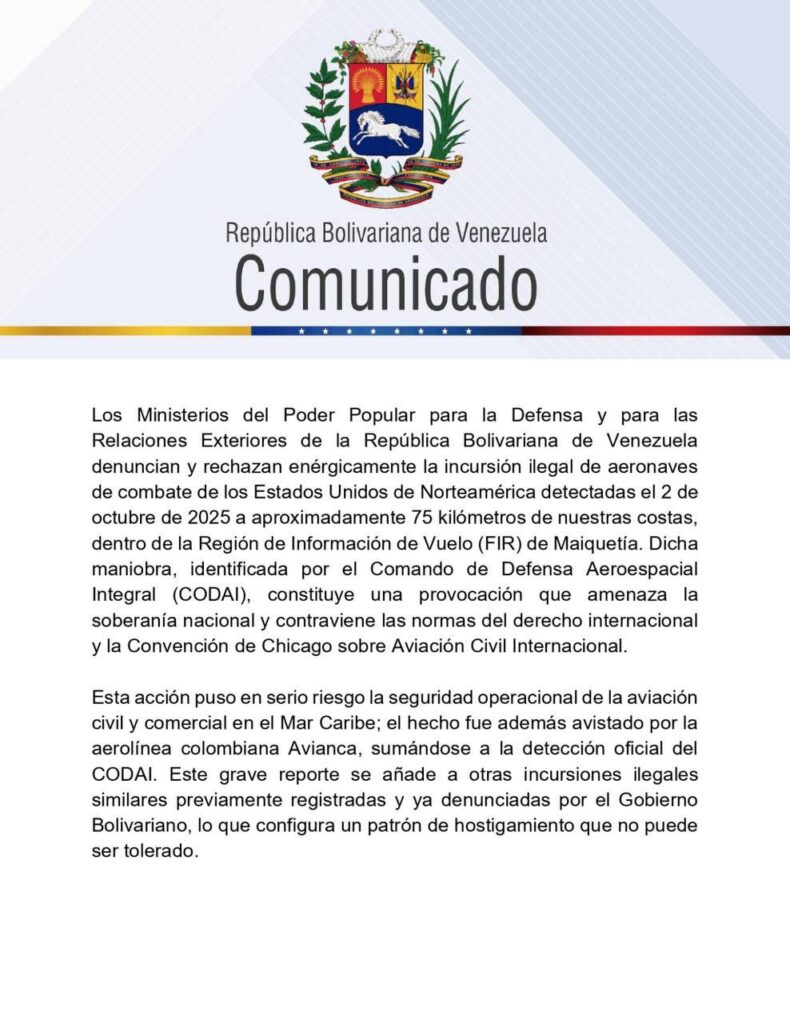 La tiranía rechazó «enérgicamente la incursión» de esas aeronaves que, señaló, fueron detectadas este 2 de octubre «dentro de la Región de Información de Vuelo (FIR) de Maiquetía», lo que, además, fue identificado por el Comando de Defensa Aeroespacial Integral (Codai).