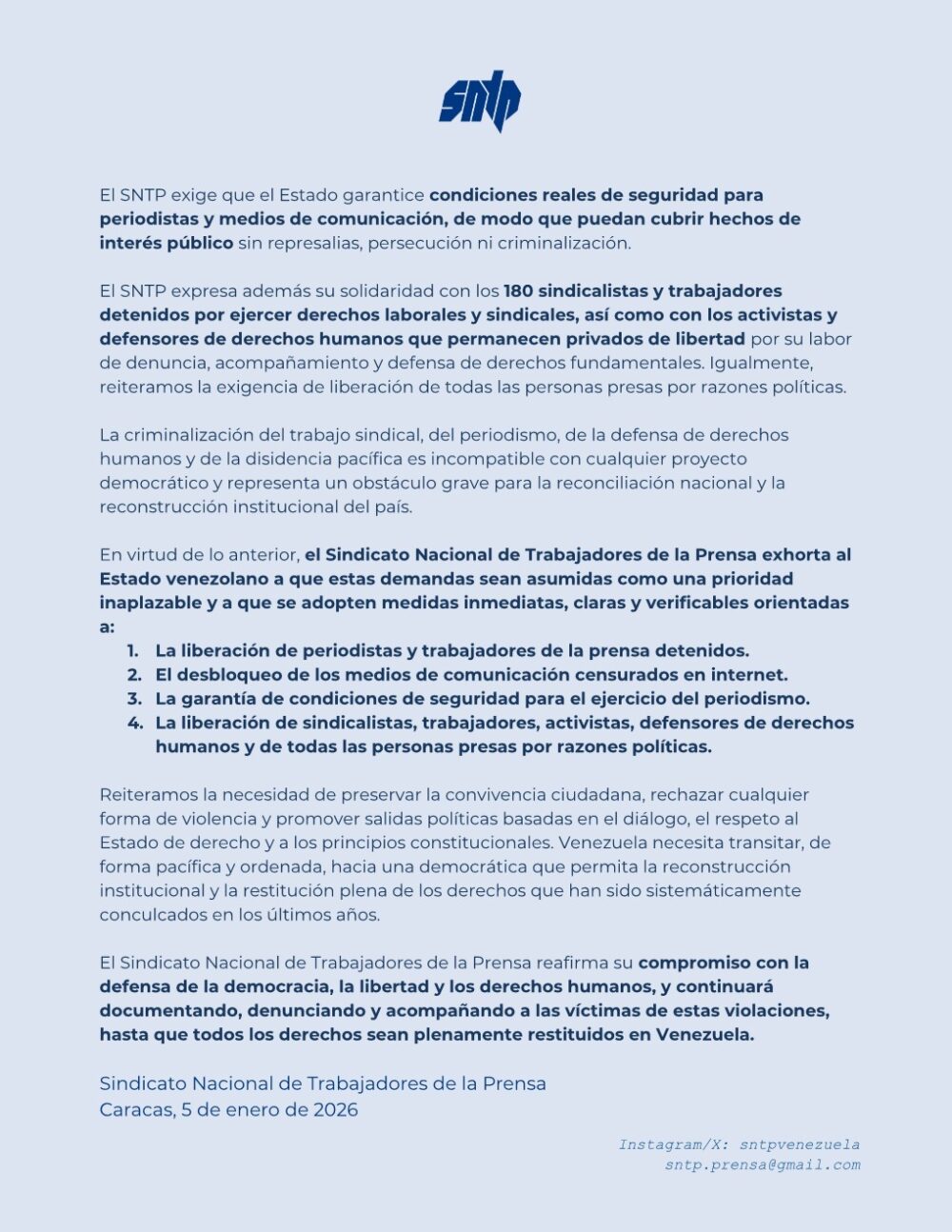 El Sindicato Nacional de Trabajadores de la Prensa (SNTP) exigió este lunes 5 de enero la liberación de los 23 periodistas y trabajadores de la prensa, así como también el desbloqueo de más de 60 medios de comunicación bloqueados por el régimen de Nicolás Maduro.
