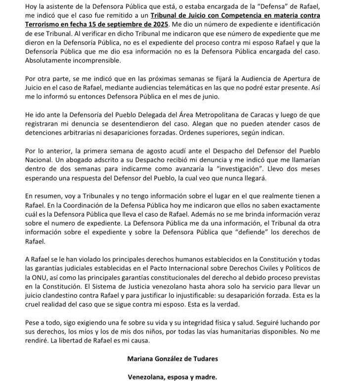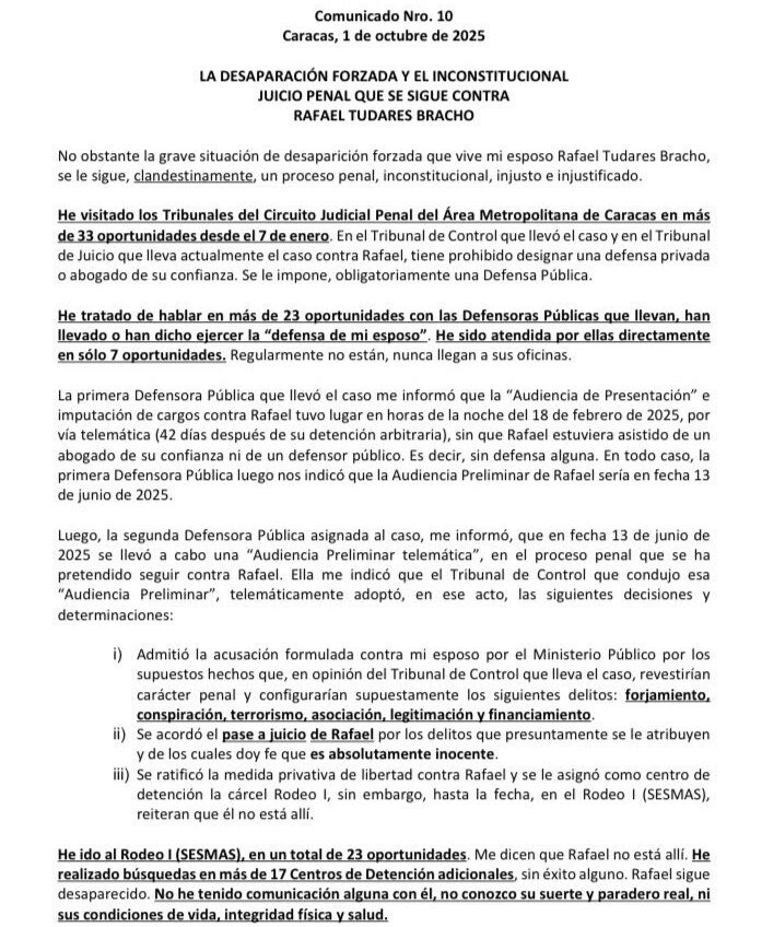Ante esta situación, su esposa Mariana González de Tudares publicó en sus redes sociales un documento en el que explica todas las gestiones que ha realizado desde el día de la detención de esposo, sin obtener una respuesta cierta sobre su lugar de detención ni el estatus de su caso.