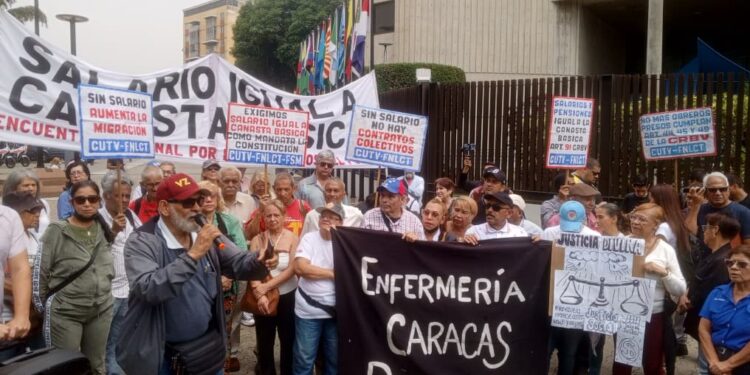 Profesores universitarios, junto a trabajadores, jubilados y pensionados, se concentraron este miércoles 15 de abril frente a la sede del Tribunal Supremo de Justicia (TSJ), en Caracas, para exigir una respuesta a la demanda por omisión constitucional introducida en febrero en defensa de salarios dignos.