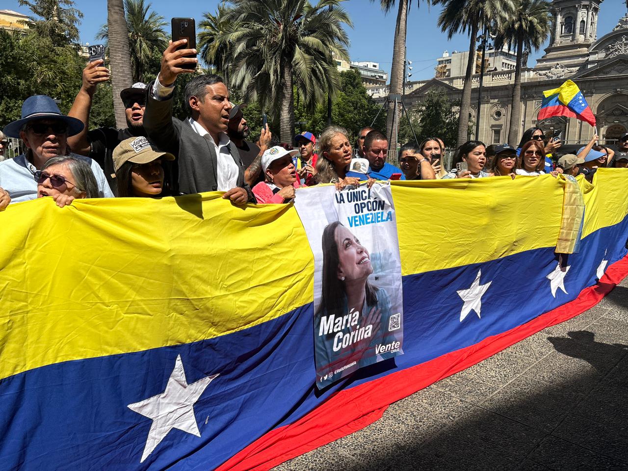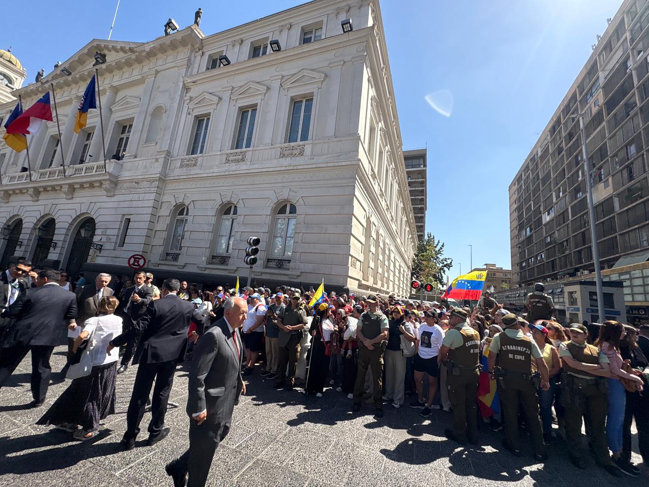 Los venezolanos en Chile se concentran este jueves en la Municipalidad de Santiago a la espera de la líder venezolana y Premio Nobel de la Paz 2025, María Corina Machado, quien recibe la llave de la ciudad, en el Palacio Consistorial de la Municipalidad de Santiago.