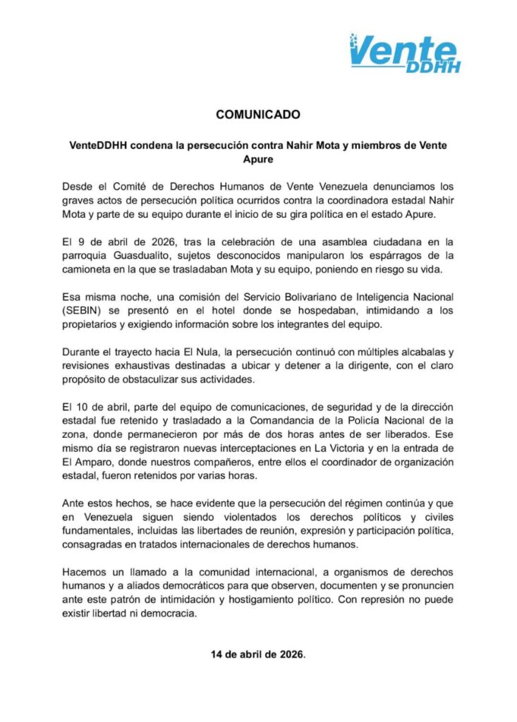 El Comité de Derechos Humanos de Vente Venezuela denunció este martes una serie de actos de persecución política contra la coordinadora estadal del partido en Apure, Nahir Mota, y parte de su equipo durante el inicio de una gira política en el estado llanero los días 9 y 10 de abril.